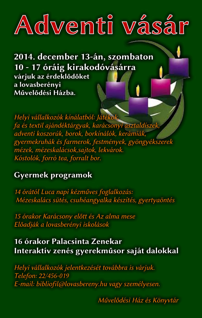 Adventi vásár 2014. december 13-án, szombaton 10 - 17 óráig kirakodóvásárra várjuk az érdeklődőket a lovasberényi Művelődési Házba. Részletekért kattintson a képre!