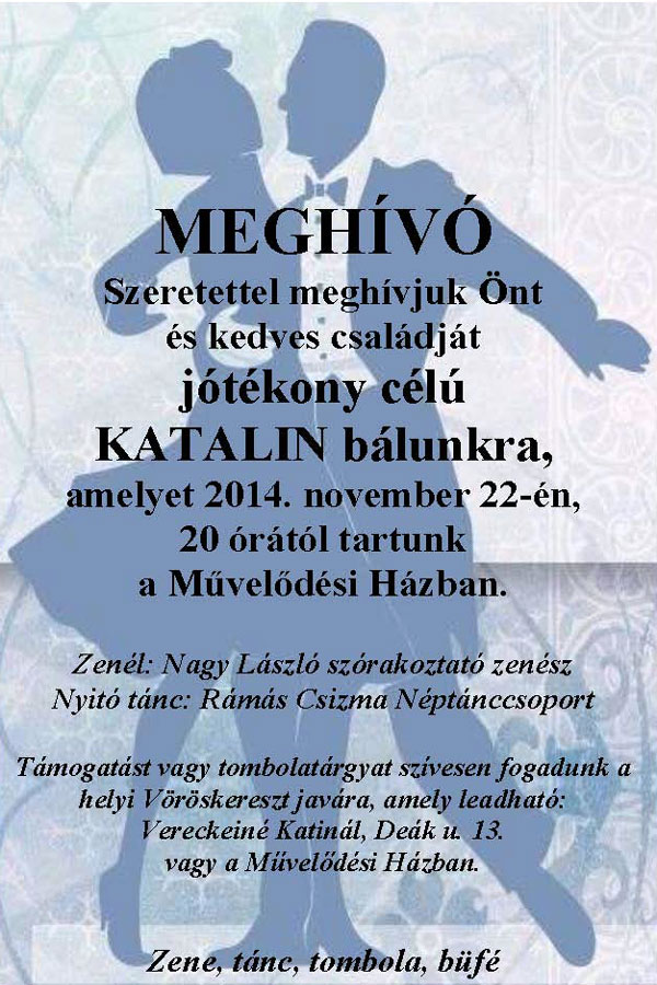 Katalin Bál Szeretettel meghívjuk Önt és kedves családját jótékony célú KATALIN bálunkra! Részletekért kattintson a képre!