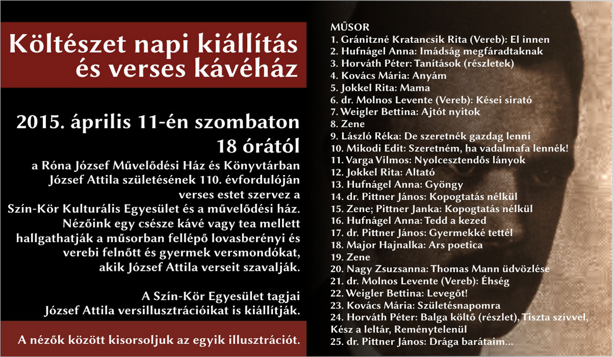 Költészet napi kiállítás és verses kávéház 2015. április 11-én szombaton 18 órától a Róna József Művelődési Ház és Könyvtárban József Attila születésének 110. évfordulóján verses estet szervez a Szín-Kör Kulturális Egyesület és a művelődési ház. Részletekért kattintson a képre!