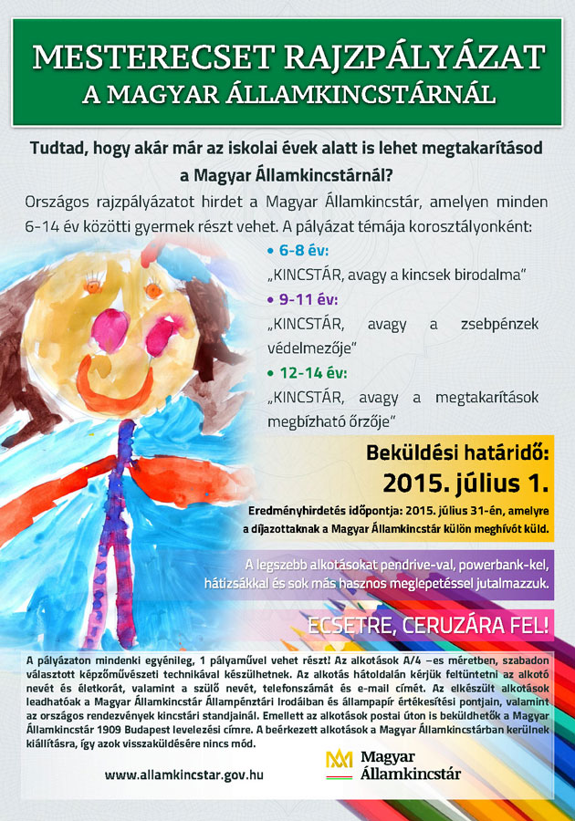 Rajzpályázat Országos rajzpályázatot hirdet a Magyar Államkincstár, amelyen minden 6-14 év közötti gyermek részt vehet. Részletekért kattints a képre!