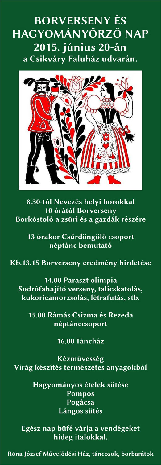 Borverseny és Hagyományőrző Nap 2015 A borversenyt és hagyományőrző napot rossz időben a művelődési házban tartjuk meg. Részletekért kattints a képre!