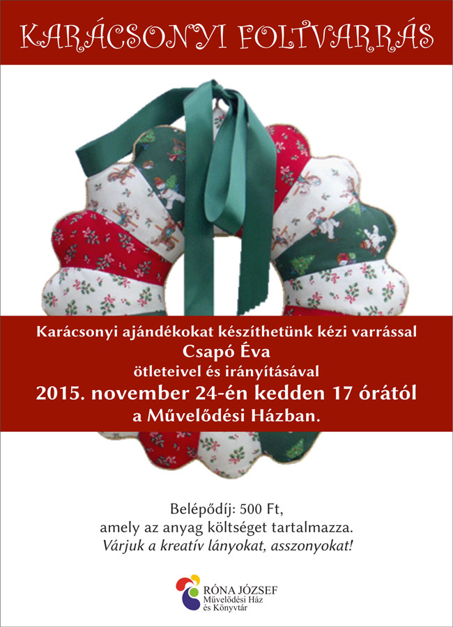 Karácsonyi foltvarrás Karácsonyi ajándékokat készíthetünk kézi varrással Csapó Éva ötleteivel és irányításával. Részletekért kattintson a képre!